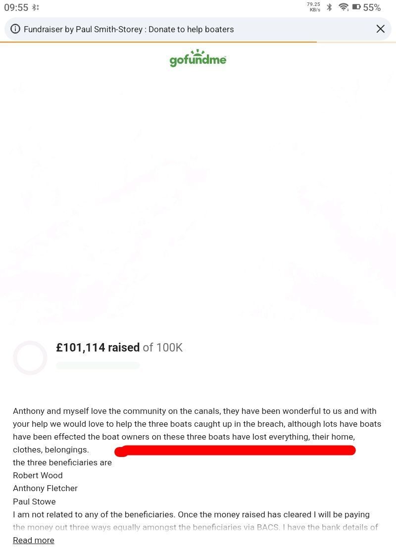 I didn't edit anything out. I said it how I see it. I can say it again. Claiming that people 'lost everything' was not accurate. Using extreme language like that to drive traffic to online digital content is dangerous because it can potentially erode trust. If the wording was "people are standing on the towpath at 4am in the rain looking at their Boats which are in a field full of water" would it have got £100k? "Lost everything, their homes clothes and possessions" is wording which should have been updated when it became obvious the next day what the actual position was. Particularly for the vessel called Pacemaker because all that happened to that one is it why aground in a flat canal bed. It's incredibly unlikely that there is any damage more serious than broken wineglasses. I guess I am alone in being concerned about morals and trust. Nobody else cares.