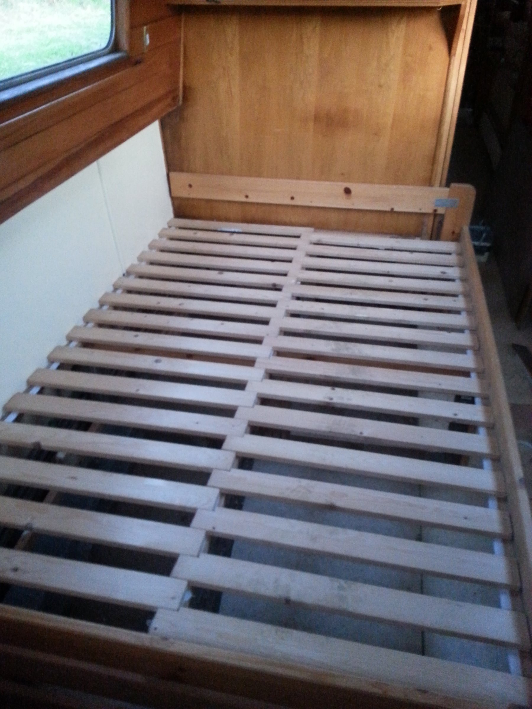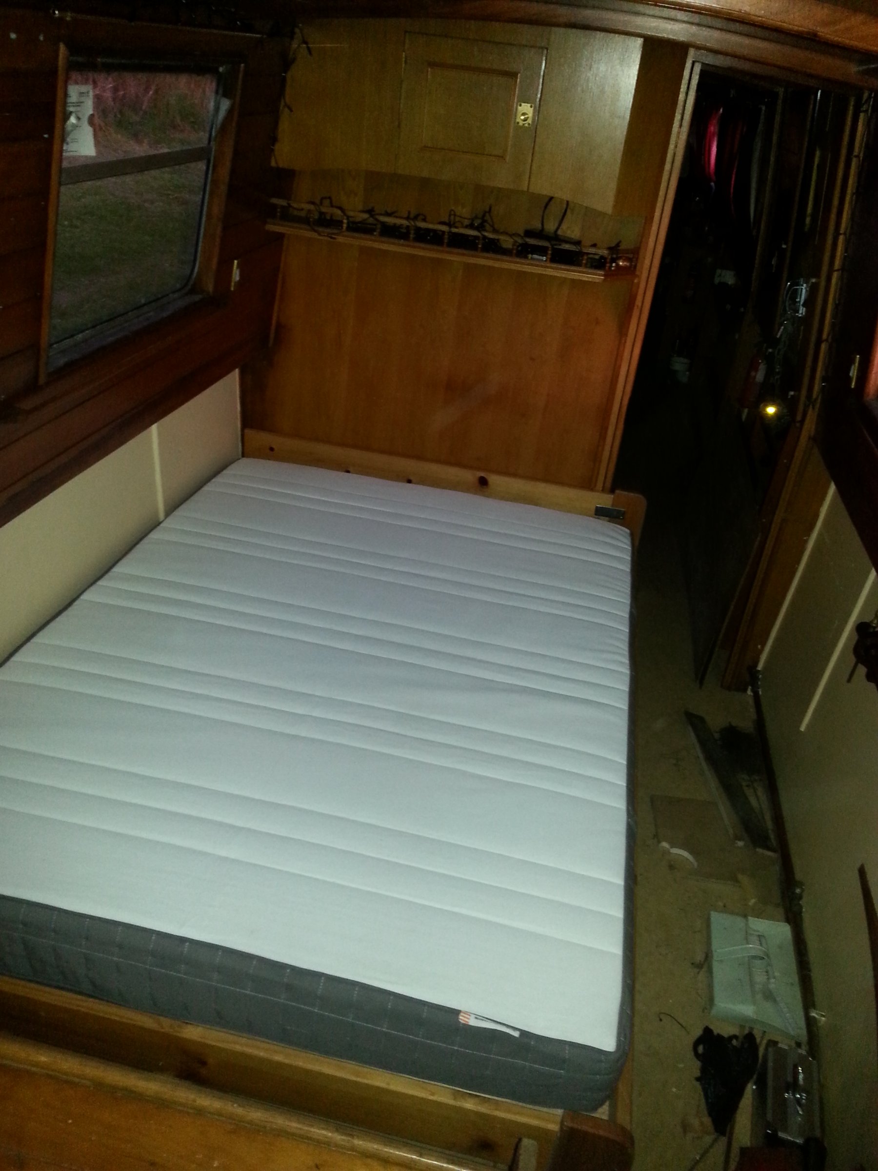 3. After 11 years, I've finally gotten around to building a full-sized double bed. I always felt squashed in the 190 x 120cm fitted bed when there's two of us aboard, but worried a bigger bed would restrict access. I like fold-away beds but I'm 1) not clever enough to build one and 2) too lazy to deal with the getting out and putting away of it. In the end, it only encroaches a little into the aisle space so I'm happy with that. All the wood is salvaged though the mattress is new and I might get around to making a more elegant headboard in another 11 years time!