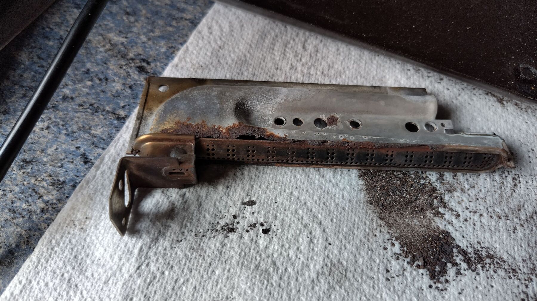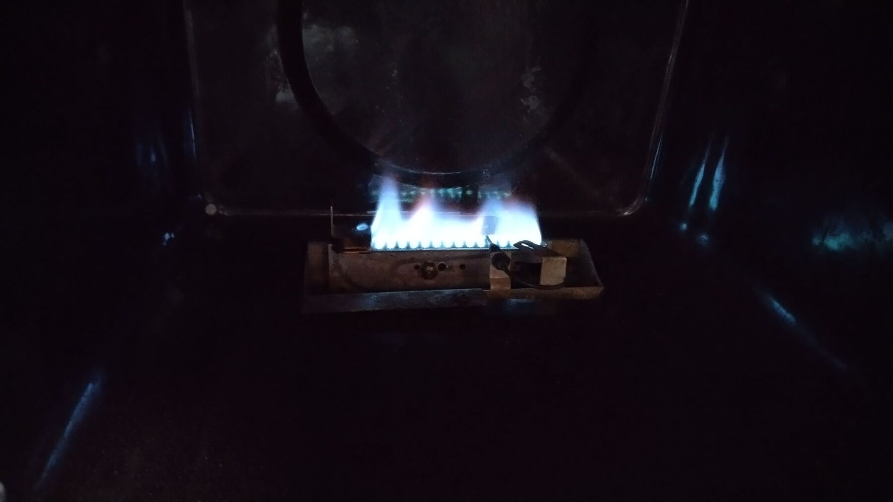 Over the past few months our oven has been making a sputtering sound. Occasionally, when just lit, it would extinguish, but if it stayed lit for a few minutes it would be fine, but the sputtering would come back if the door was opened, presumably due to an ingress of air. All the while the grill, which is off the same gas line, would work fine (the hobs are off a different line). Now a few days ago the sputtering got so bad it finally prompted me to take things apart after all these years. 😄 The burner was in a bad state at the back as per first picture. Fortunately (and amazingly) these are still readily available so I've ordered a new one. I'm not totally convinced this is what caused the sputtering though because I temporarily glued a craft blade to cover the holes, cleaned the debris out and cleaned the jet as best I could with a pin and put it back together, but now the issue is as follows: the burner lights and burns with an improved flame (second picture) but then extinguishes after two to three minutes. So here is a question for the few who might still have one of these appliances: when I put the burner back I wasn't sure if I was to pass the bolt through the second hole to the left (as per picture 2) or the extreme left one next to it. The bolt almost aligns with the extreme left hole, which would give a snugger fit to the jet, but I didn't want to force it and risk snapping the bolt. I'd be grateful if anyone who still has one of these could take a look and report back. I'm annoyed that I didn't take a photo before disassembling as I normally would, but I had it in mind I had an earlier picture on my phone, which I can't now find.