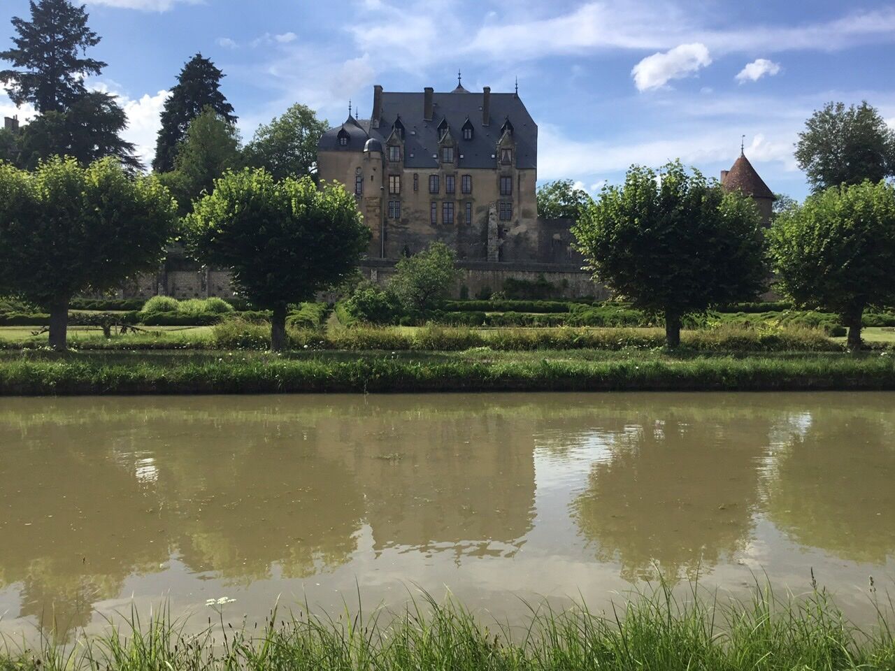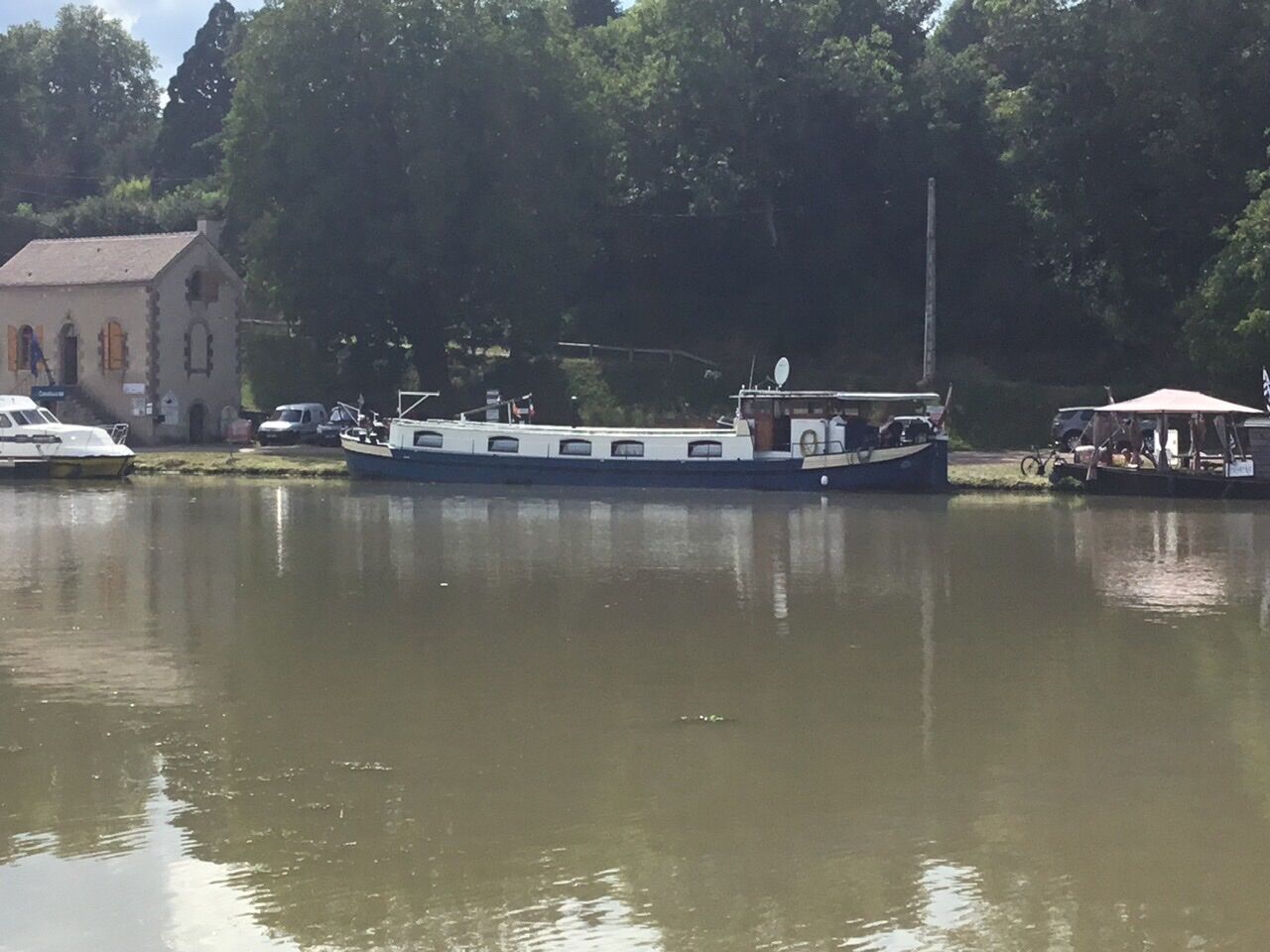 Today 2018 in Chatillon en Bazois on the Nivernais. Good mooring ready for the fireworks. The boat behind is a wooden replica of the Loire boats and he makes and sells crepes. There is a 180 degree bend after a bridge upstream which is really difficult.