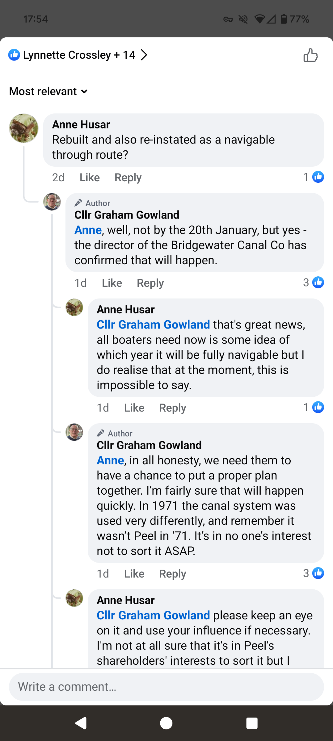 Councillor Graham Gowland has posted on Facebook that the Director of the Bridgewater Canal Company has confirmed to him that the canal will be rebuilt and re-inststed as a navigable through-route.