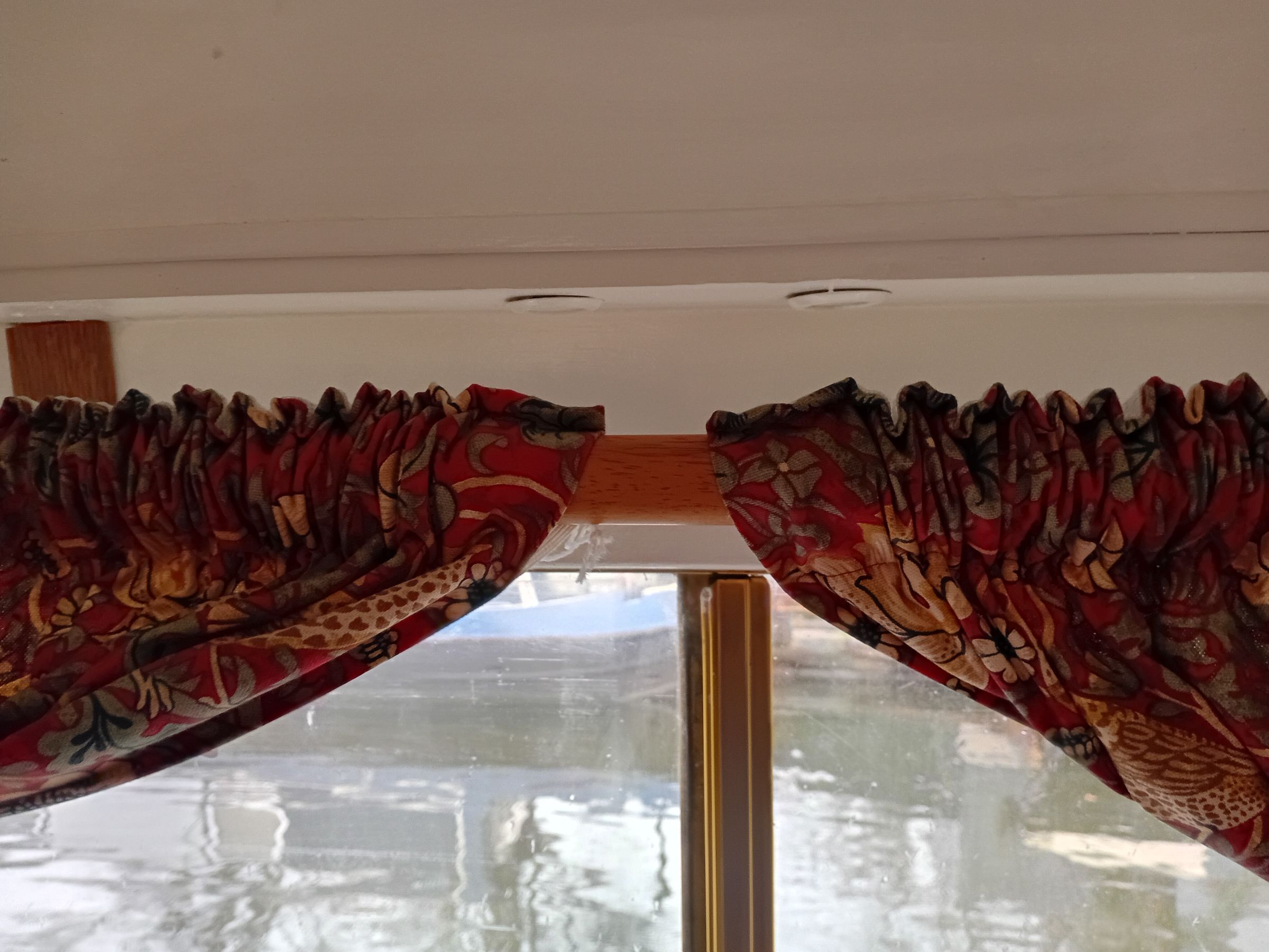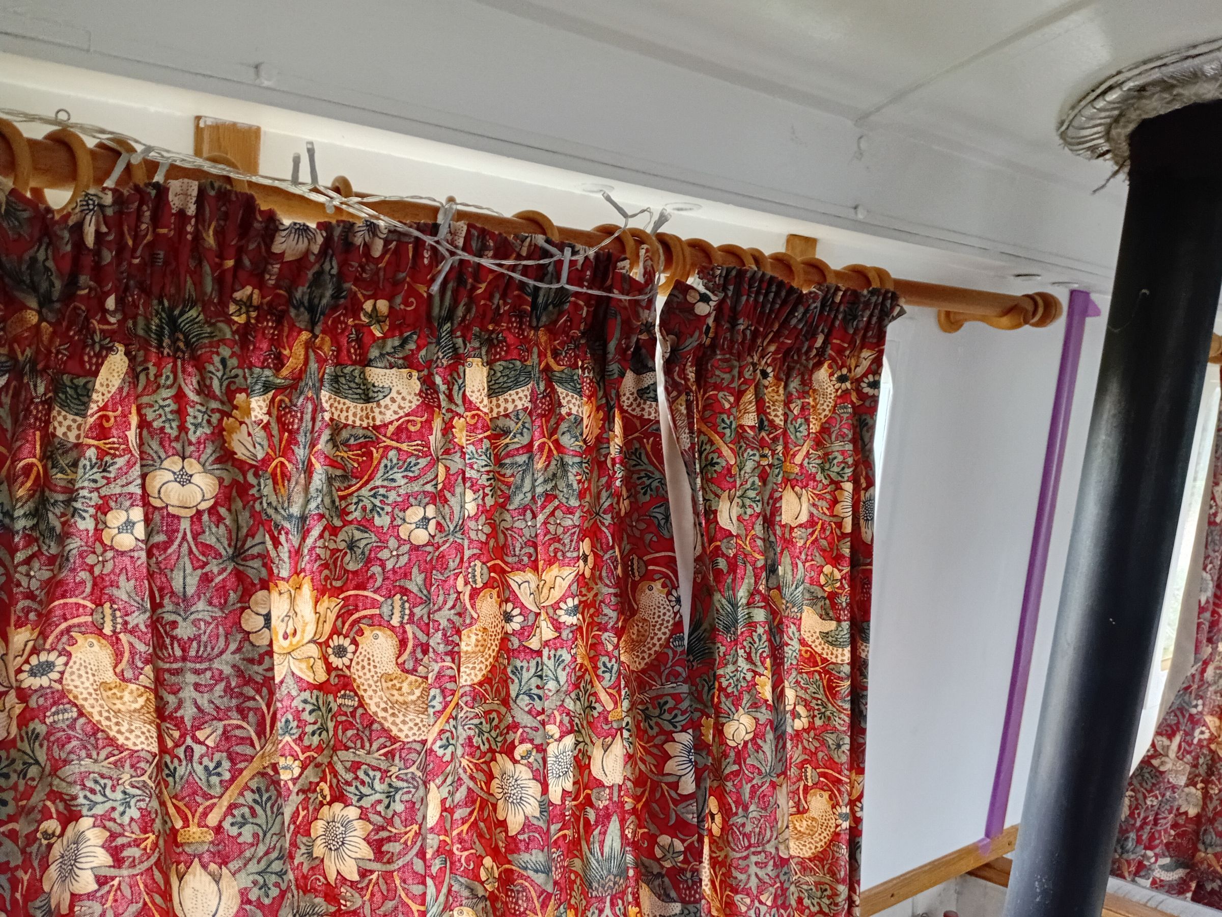 LadyG Posted December 14, 2025 Report Posted December 14, 2025 (edited) I bought my curtains unlined, they have some sort of coating, possibly fire proofing. The 28mm diam fit perfectly, I tried the curtain rings on poles but they looked weird . The curtain tape is open at either end and a 28mm pole fits perfectly when they are pushed thru the curtain tape "pocket". The tape is about 3 inches deep. I bought six poles 120cm, this does not allow the threaded curtains to open completely when not in use but the 150cm poles looked too long with my oak panelling. 16 hours ago, Sid Charles said: Hi Guys Where do you turn for narrowboat curtains? I have seen loads on boats and never thought to ask who runs them up, or is it a case of DIY, trouble is I don't have a sewing machine. I bought curtains from John Lewis, by Morris & Co, 117 width and 137 drop. £67 per pair. 45 minutes ago, LadyG said: I bought my curtains unlined, they have some sort of coating, possibly fire proofing. The 28mm diam fit perfectly, I tried the curtain rings on poles but they looked weird . The curtain tape is open at either end and a 28mm pole fits perfectly when they are pushed thru the curtain tape "pocket". The tape is about 3 inches deep. I bought six poles 120cm, this does not allow the threaded curtains to open completely when not in use but the 150cm poles looked too long with my oak panelling. I bought curtains from John Lewis, by Morris & Co, 117 width and 137 drop. £67 per pair. I expect brass rods would work instead of my 28mm oak poles, but not domestic curtain track, it depends on the boat. The poles dont look oversize, the curtains mistly cover them, they are six inches longer than windows either side. I threaded five curtains and have rings on the window near the fire to make sure they are clear of the stove . I think I only looked at them the day i set them up. Edited December 14, 2025 by LadyG