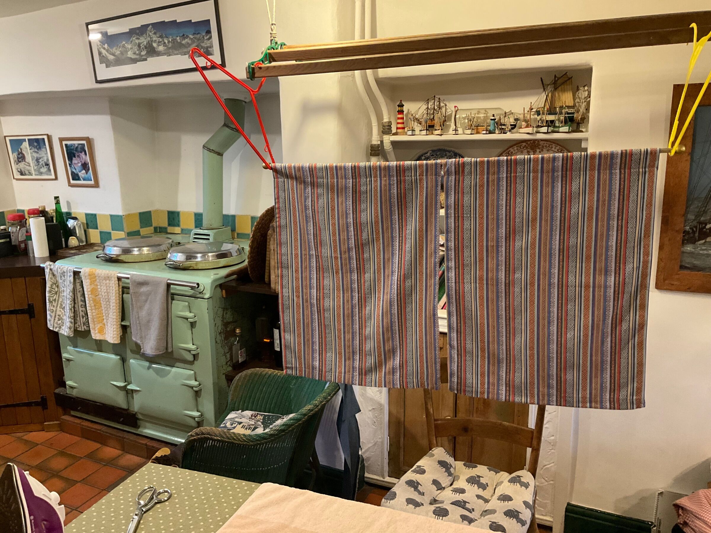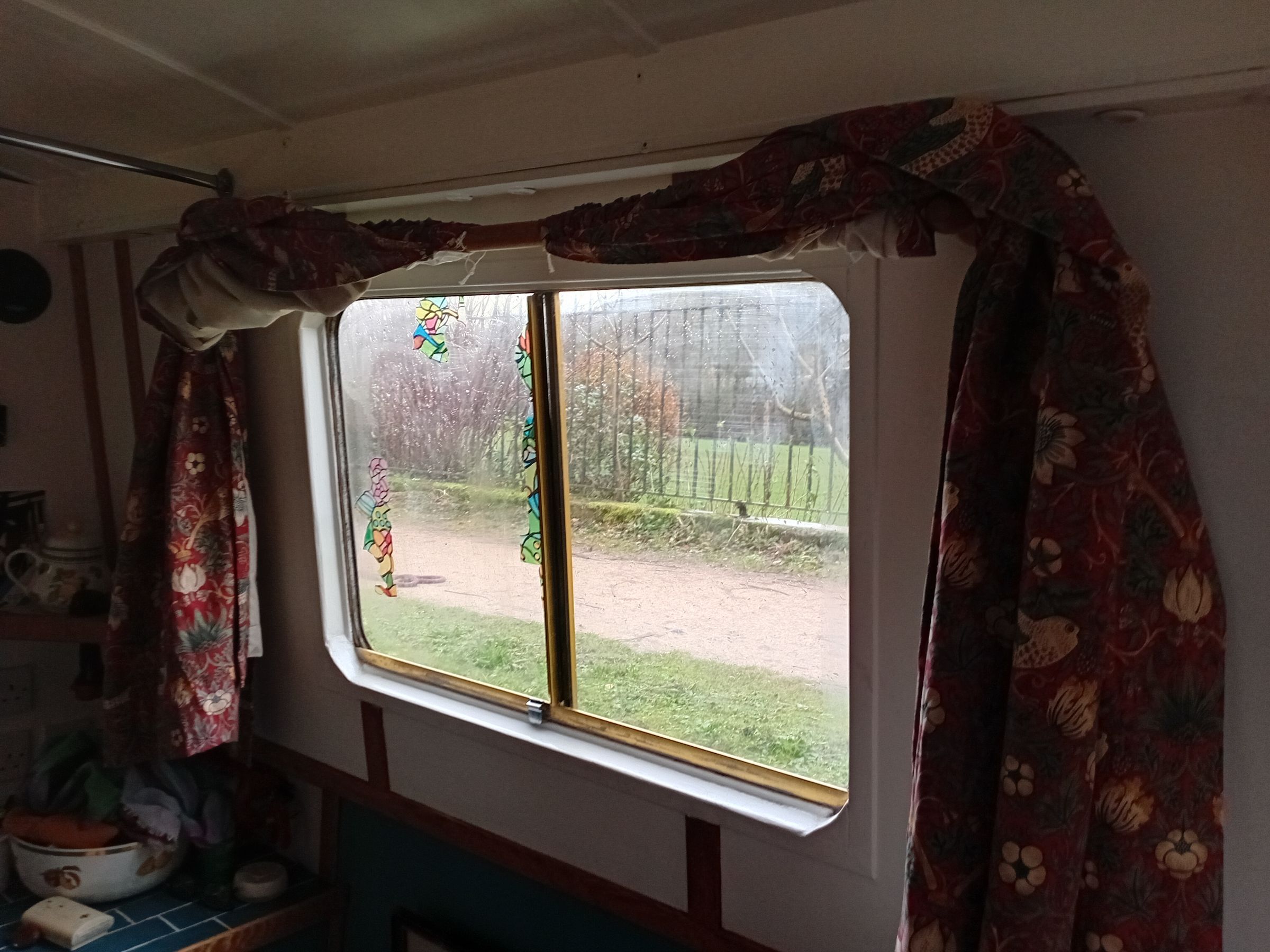 Tony Brooks Posted December 14, 2025 Report Posted December 14, 2025 (edited) 13 hours ago, LadyG said: Duplication I had a set of home made, came with boat, amateur track. I bought six poles 28mm diam and the curtains are threaded on. Poles cost about same as curtains. Buy curtains then fix poles higher than normal in a house I think buying ready made and cutting to length is the way to go ... I can't help thinking that many ready-made curtains will be too thick and bulky for typical narrowboat windows. I also think that curtain poles over an inch in diameter and shortened to fit typical narrowboat windows will also look out of proportion and odd. Then there is the question about how the ready-made curtains are attached to the pole. In the size mentioned, I think domestic curtain rings would look out of proportion, and curtains where the pole fits through large metal rings in the top of the curtain would make any bulkiness worse. It is a matter of taste, but I think the brass rods as shown by @Peugeot 106 threaded through the top hem or through small brass rings sewed onto the top back of the curtain look far more in keeping than many ready-mades and domestic poles will ever be. I agree the lack of a sewing machine is a problem, as will be storing one on a boat, but it Peugeot and myself can make them it should not be beyond many. It just needs a bit of thinking about before jumping in, and if one DIYs there is no need to do things the way a curtain maker may, you can work out the simplest way for yourself. Here are the curtains I made, some years on so they have faded a bit (best photo I now have): For all the other windows, I chose roller blinds with an L shaped channel at either side to keep them flush with the cabin side. You can just about see this on the galley window on the left of the photo. In fact, mail order blinds were as cheap or cheaper than ready-made curtains. Edited December 14, 2025 by Tony Brooks